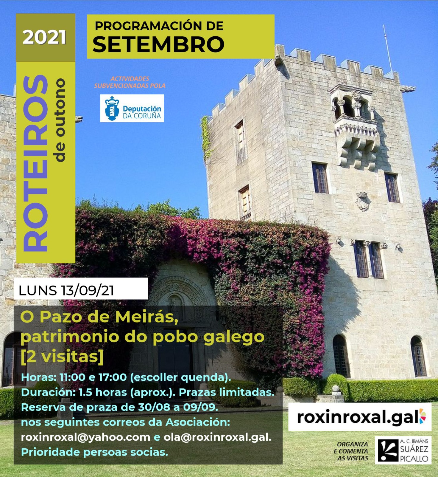 Este vindeiro luns 27 de setembro celebrará as ultimas visitas que vimos organizando todos os luns no Pazo de Meirás de maneira ininterrumpida. Será mediante convites das nosas socias e socios durante a mañá, e coa Asociación Cultural Roxin Roxal durante a tarde.